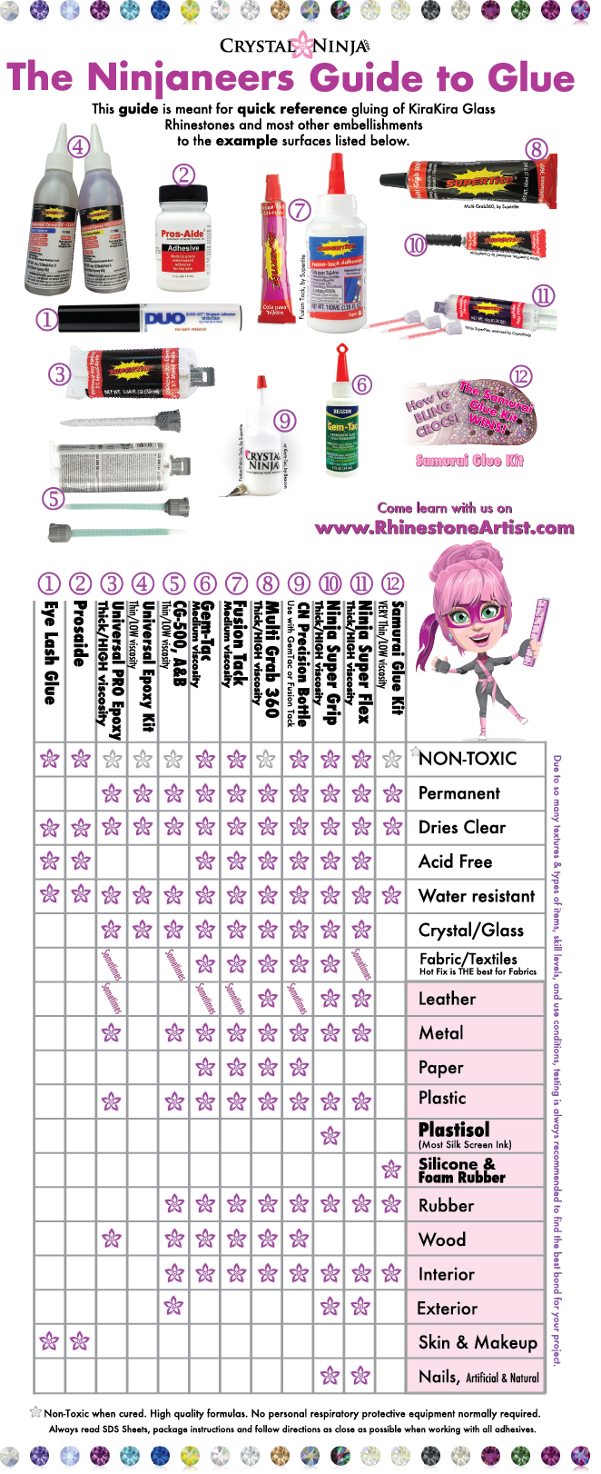 Our Glue Guide below and the INTERACTIVE GLUE GUIDE gives you a clear starting point for choosing the right adhesive for rhinestone work. This page shows our printed one-page glue chart, designed to help you quickly compare glue types by surface, flexibility, cure time, and wear level. It serves as a practical reference for both beginners and experienced artists.