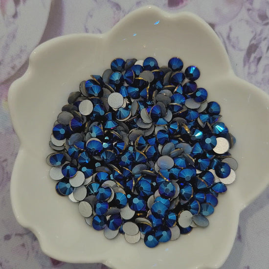 Aurora Borealis (AB) rhinestones feature a specialty coating applied to the surface of the crystal. This coating creates a shimmering rainbow effect, reflecting warm golds, soft pinks, and vibrant blues depending on the lighting and angle. AB stones are ideal for adding dimension and light play to any design, but they are different from clear or solid-colored crystals; they are treated to sparkle in multiple tones, not one static hue.