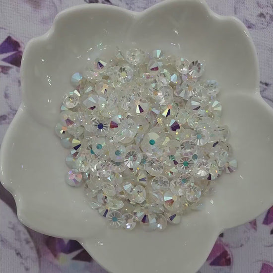 Aurora Borealis (AB) rhinestones feature a specialty coating applied to the surface of the crystal. This coating creates a shimmering rainbow effect, reflecting warm golds, soft pinks, and vibrant blues depending on the lighting and angle. AB stones are ideal for adding dimension and light play to any design, but they are different from clear or solid-colored crystals; they are treated to sparkle in multiple tones, not one static hue.